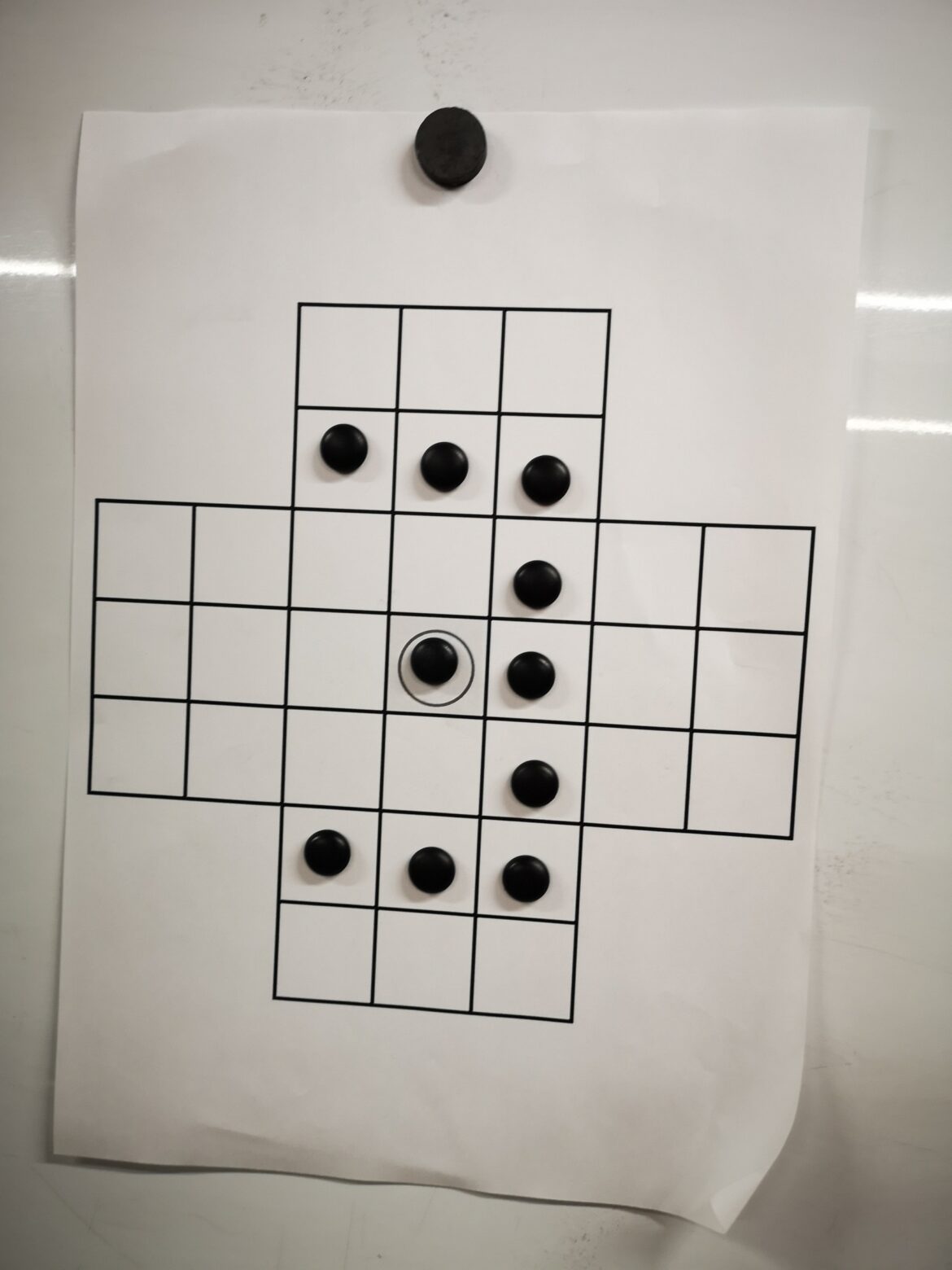 マス目が書かれた紙の上に駒を置き、特定のルールに則って駒を動かして駒を最後の一つにしたら勝ちというパズルゲームで、みんなで一生懸命、頭を悩ませました!