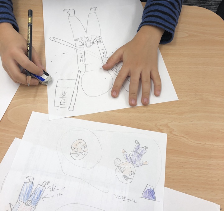 考えていた通りにはじめのページを作ります。観音開きになるように紙を組んで、お爺さんとお婆さんの絵を描きます。柴刈りにいくお爺さんのカゴにはロボットのアーム、洗濯にいくお婆さんの洗濯物は荷台というように、何か昔話にはない器具が入っています。K君いわく、「現代の要素も入れて面白くしたい」と。たしかに! 面白いのでやりましょう!